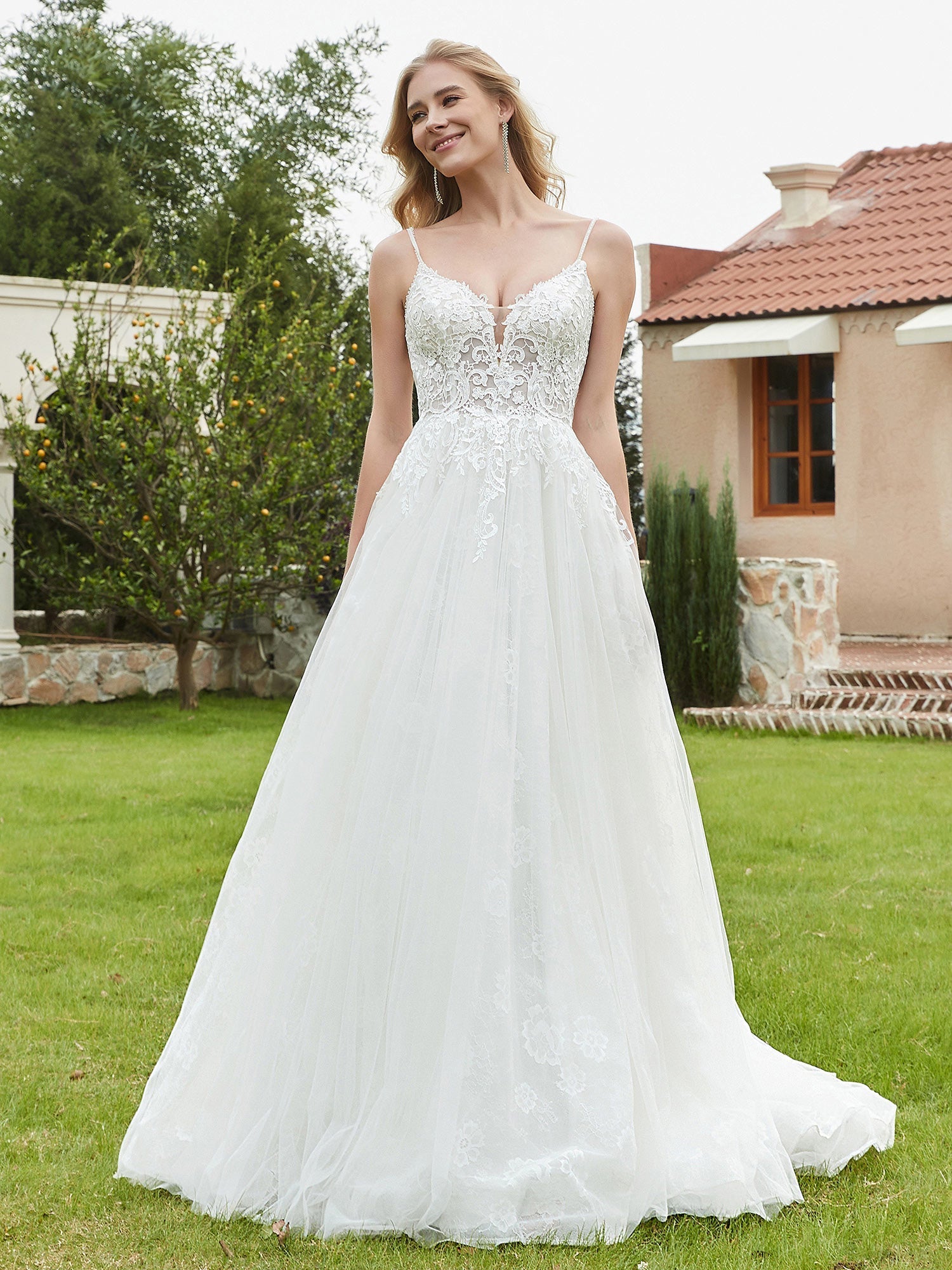 The deep V-neck creates a flattering focal point, balancing openness and elegance.Delicate details on the lace bodice add a touch of vintage charm.