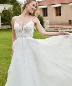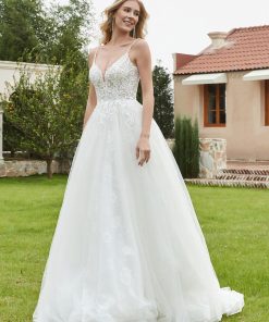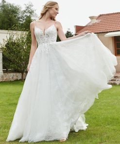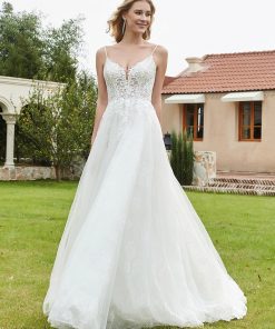 The spaghetti straps create a sophisticated yet modern feel, framing the shoulders and adding elegance to the overall silhouette.