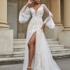 Attain an exquisite look in our Kalee wedding gown. The enchanting V-neckline, intricate applique, and ruched details impart stylish texture and form to this A-line dress.